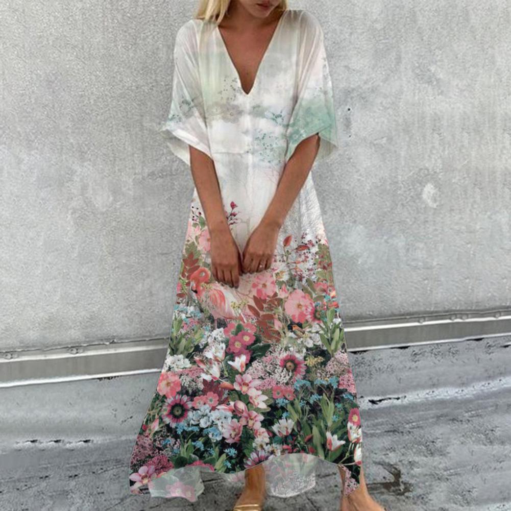V-Neck Half Sleeve Large Hem Elegant Dress Vivid Flower Printing Ladies Loose Maxi Dress Female Clothing