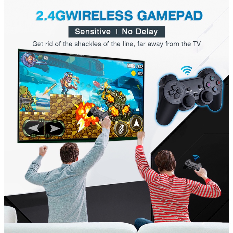 6. Smooth lines, simple and elegant design, plug and play, with wireless handle, the wireless control range is up to 8 meters. Compared with the short-wired wired handle, the wireless handle avoids getting close to the TV and protects your eyes more effectively. Mini host with wireless handle.