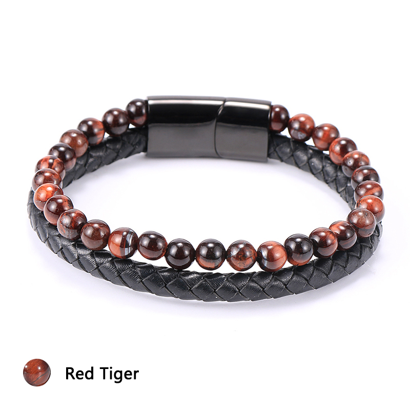 Item::Vintage Men's Jewelry Black Genuine Leather & Natural Stone Bead Bracelet Stainless Steel Magnetic Buckle Homme Wristband Bangle