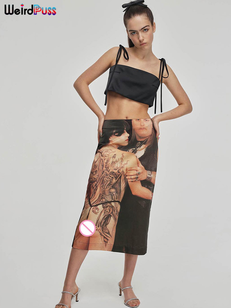 Weird Puss Straight Skirt Body Print Women Low Waist Navel Wild Casual Streetwear Party Stretchy Skinny Clothing