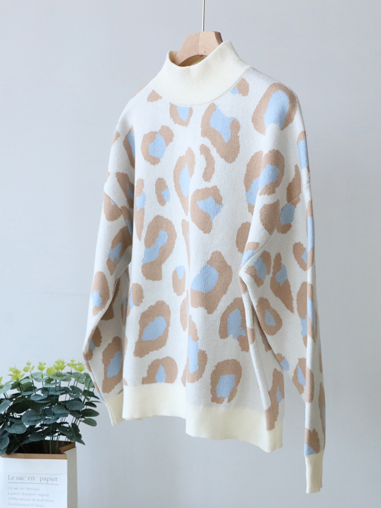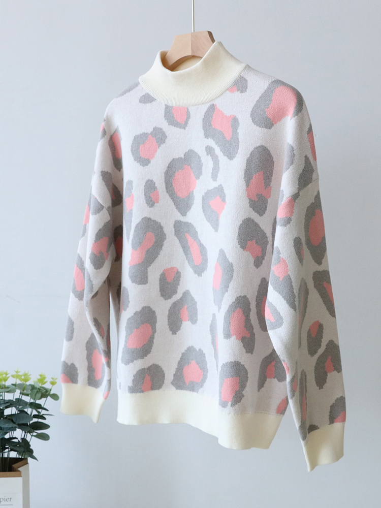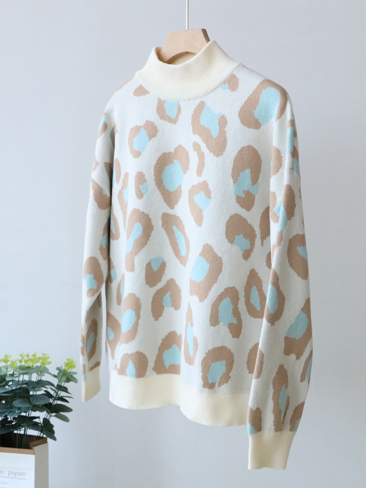 Winter Women's Sweater Leopard Print Animal Basic White Turtleneck Oversize Jumper Vintage Warm Knitted Sweaters for Women