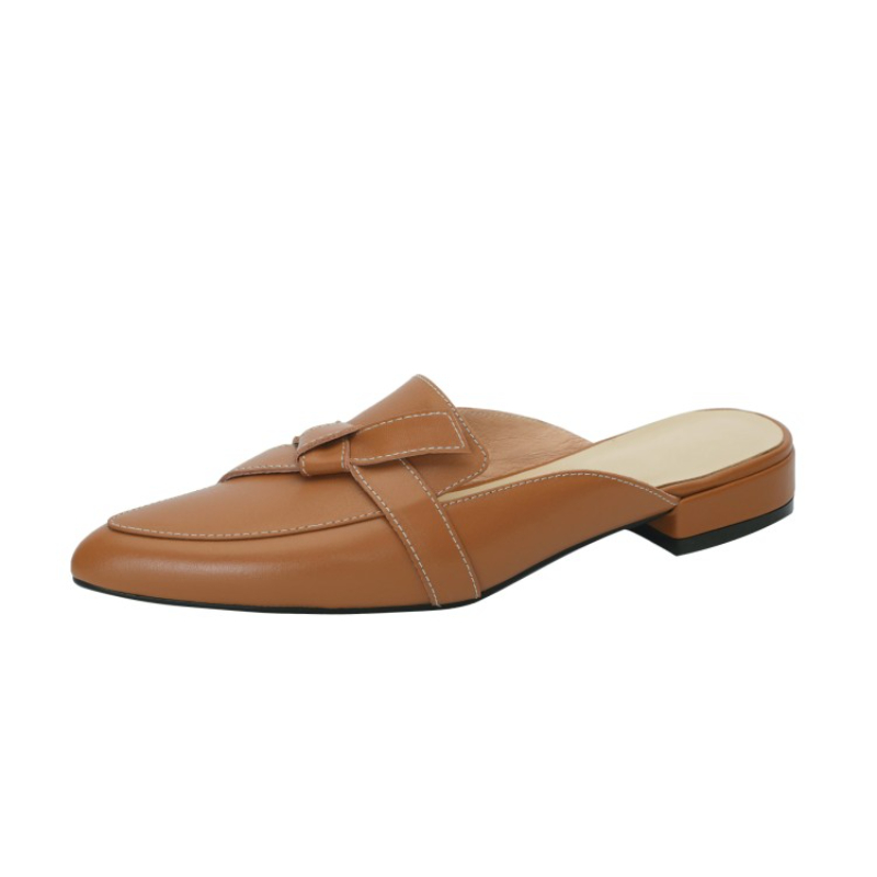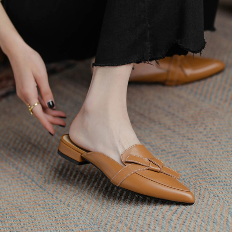 Women Natural Genuine Leather Mules Black Brown Beige Butterfly Knot Bowknot Flats Shoes Woman Women's Sandals