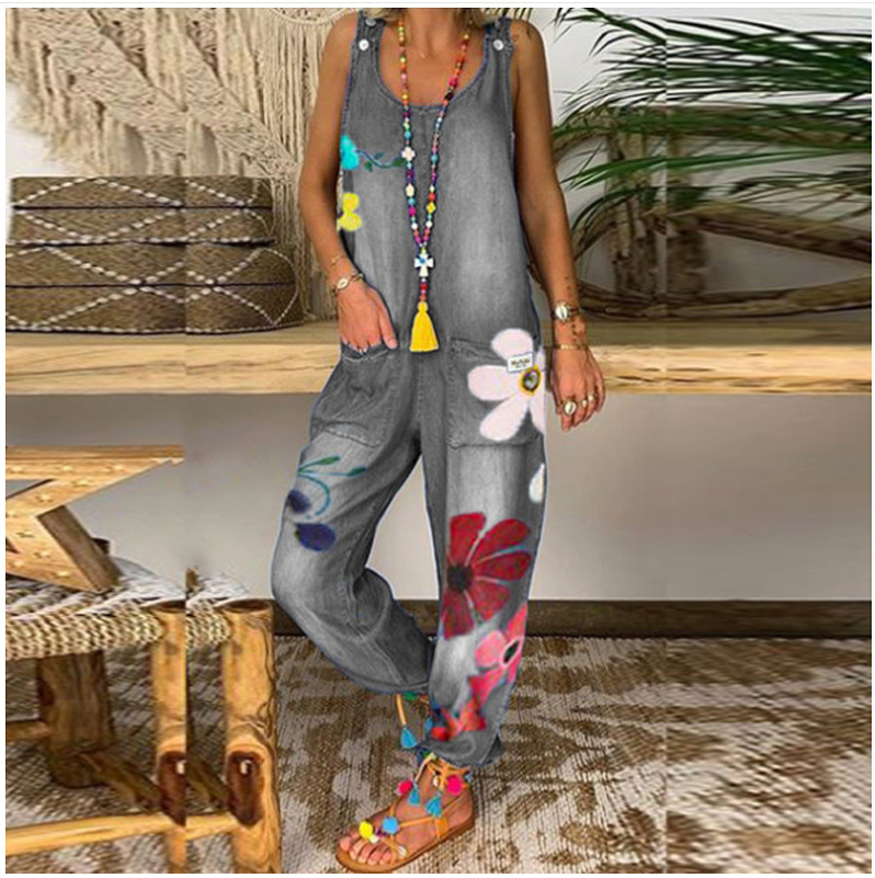 YICIYA Women's Loose Sleeveless Denim Jumpsuit Suspender Denim Collar Wide Bead Jumpsuit Blue Pocket Jeans Jean Femme Pants