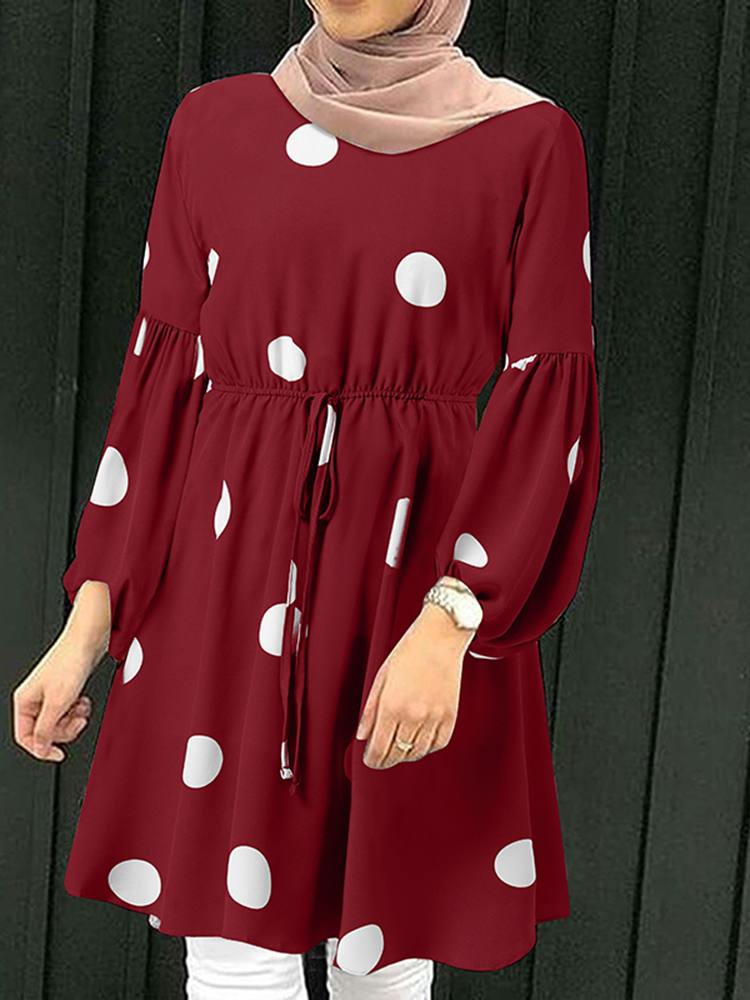 | Package included:1 Blouse Material:100% Polyester Colors:Red,Yellow,Pink,Navy Sleeve Length:Full Sleeve Neckline:O-Neck Pattern:Polka Dots printed Length:Knee Length Buckle chain:Buttons on the back Waistline:Elastic waist Thickness:Thin Decoration:Lace-Up Features:Puff Sleeve,Elastic Cuff Style:Leisure,Bohemian,Retro,Europe,Muslim Dress Abaya Kaftan Season:Spring,Summer,Autumn,Winter Occasion:Family,Party,Beach,Wedding,Holiday Attentions: 1.The Real Object May Exist Slightly Colors Differences Compared To Images As Different Computers Display.Caution If Minding,Thanks. 2.There Might Be A Manual Measuring 1-3 cm Error.Sorry For Any Inconvenience. 3.Please Prevail On Real Item, Model Images For Reference Only. 4.Attention!!!Please check the size chart carefully before placing the order.
