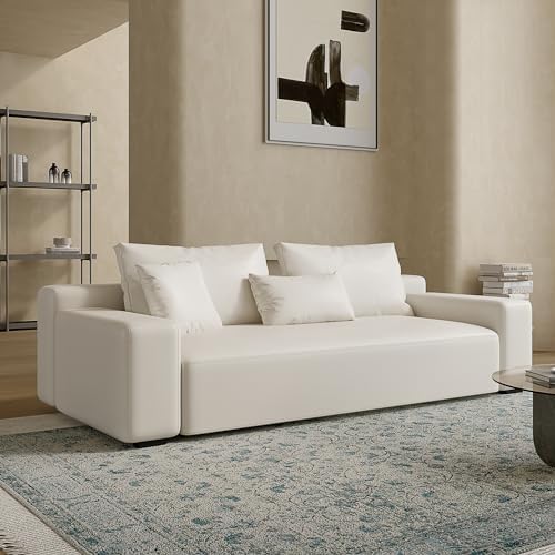This couch is AMAZING! I was torn between this one and the sectional but decided to go with this style due to the price being much cheaper than the sectional and I was NOT disappointed. It is comfortable, sturdy, and a decent size. I opted for the delivery and assemble because I’ve seen in other reviews it arrives in one box and is extremely heavy, so that helped. It arrived in one box, all the delivery drivers did was attach the bottom legs. Came with two large back pillows and a long and squared small pillow. The material is a Sherpa/teddy like material so it is a lint magnet but it’s nothing a lint roller can’t handle. The seat covers are also removable so you can wash them. The couch is firm but not too hard, still comfortable. & It is more of a off white color (which is exactly what I wanted)! 9/10! I would definitely recommend.