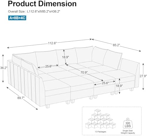 I’ve been searching for an oversized, plush and comfy sectional sofa pit. I landed on Bellfin and chose the 12 seater. From start to finish my experience was fantastic. 11 boxes arrived shortly after I placed the order off of Amazon and then I reached out to Customer Service to ask them about the 12th box. They immediately responded to my request forassistance and the box showed up the next day. The most challenging part was getting 12 boxes into an elevator and into our apartment but once unboxed I had some family members come help me put it together. I recommend following the directions given in the manual, which is located in the storage compartment of every single box, they even include a screwdriver. The couch has exceeded my expectations and as soon as it was assembled, my son fell asleep on it immediately. It could easily hold 3 to 4 large adults if sleeping.We are taller people so it really works great for our height. The cushions are firm, but the material is like an ultra suede. It’s super plush and comfortable. It will be easy to clean since all the cushions are in zippered upholstery and you could also vacuum it if you needed to. I’m so excited because I only wanted a huge pit so all my kids could snuggle with me. My dream has come true! The one thing that I had to do in addition to putting it together was add little felt feet covers so it wouldn’t scratch my tile when dragged across my floor. Other than that, all the pieces fit together perfectly and were secured so they wouldn’tslide around. I highly recommend this product and look forward to many hours snuggling with my family.