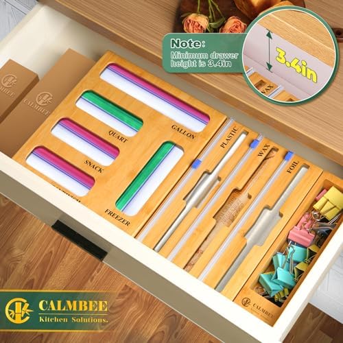 Calmbee Storage Bag Organizer, Foil and plastic Wrap Organizer with Cutter, Kitchen Organizers and Storage Compatible with Gallon, Quart, Sandwich, Snack Bags and 12" Aluminum Foil & Wax Paper