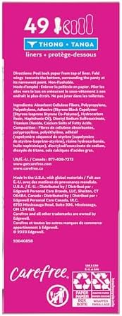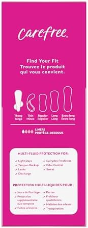 Introducing a whole new look for the Carefree brand you know and love. Carefree panty liners are designed to deliver comfort and multi-fluid protection against leaks, periods, odors, and everything in between. Carefree thong liners are discreet and made to fit thong underwear, to provide you confidence no matter what you wear. Stay-put wings keep your liner in place for a secure, no-shift fit, and end-to-end adhesive eliminates bunching. These liners for women can be used for every day freshness, odor control, sweat, unexpected periods, light days, tampon backup, leaks, and discharge.