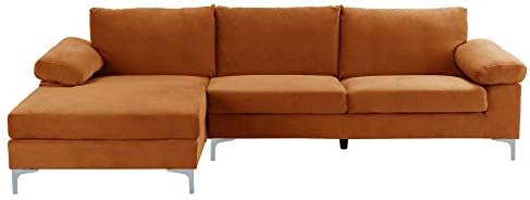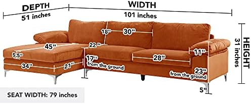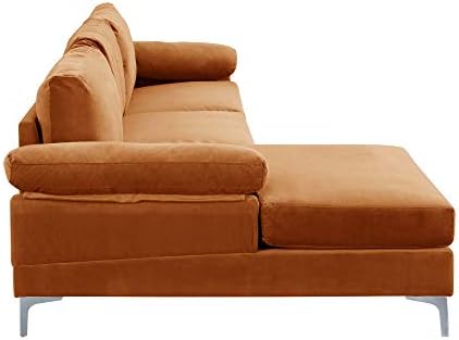 Family room / living room sectional sofa with an extra wide chaise lounge for maximum comfort Ultra soft and durable velvet fabric upholstery loose back pillows for a plush look and feel 5 people can sit comfortably in this couch Available in various fun and vibrant colors to best fit your home decor Plush and durable memory foam seat cushions Some assembly is required - Assembly instructions and hardware included
