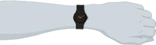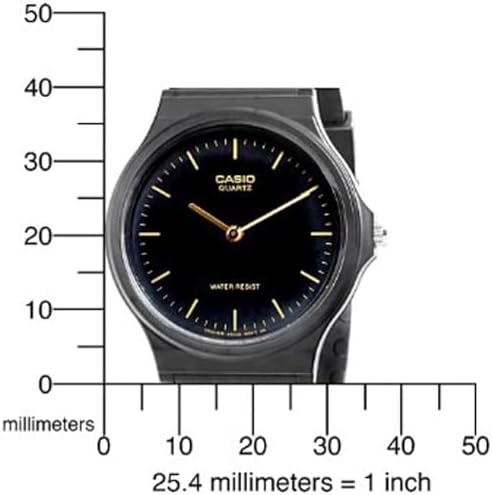 The basic black-and-gold design of the Casio Men's Analog Watch makes it a simple, versatile timepiece great for everyday wear. The watch is constructed with a resin case, a black stationary resin bezel, and a comfortable black rubber bracelet with an adjustable buckle clasp. A durable mineral window protects the black dial face, which cleanly features gold-tone hour indexes, gold-tone minute markers, and complementary watch hands.