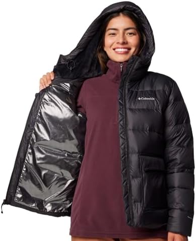 Made for everyday city living and out there adventures, this Columbia women’s jacket is insulated with 650-fill responsibly sourced down and lined with thermal-reflective tech that captures warmth. It’s rain-and-stain-resistant, with a plush fleece-lined hood and pockets galore for stashing essentials. Columbia offers this jacket in multiple colors and sizes. Regular fit.