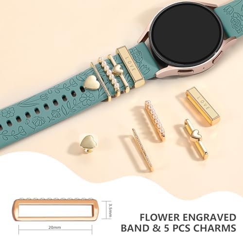 DaQin Flower Engraved Band Compatible with Samsung Galaxy Watch 7 Band/FE 6 5 4 40mm 44mm,Galaxy Active 2, 20mm Watch Band Soft Silicone Replacement Strap with Decorative Charms Accessories Women