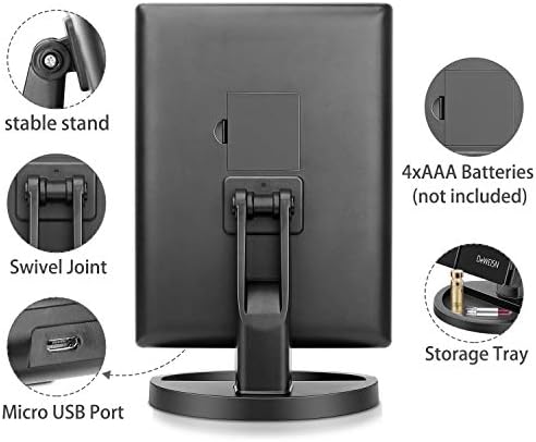 Great mirror. Easily portable and it has a touch light that is on the large middle mirror that is very bright and useful when powered by the USB cable. I have tried it with batteries as well (especially when I misplace the cable or am not near a plug-in/outlet) and the lights are not even half as bright as when it is plugged into an outlet. But that’s been the case for many different lights and electronic items that I have owned, so it’s not the mirrors fault by any means. The mirror is great and can be adjusted to a number of angles and degrees. The magnification in all the mirrors is crystal clear and quite wonderful if you ask me. I love the way it closes when not in use and it’s pretty compact so it can be stored away until needed. However the base/stand is an oval shaped bottom and I find myself more often Then not tipping the mirror over backwards due to the length and weight of the top of it (I want to literally lay it horizontal at times, and I can’t because it will just tip backwards. Every time. ) I understand why it does it and I admit it’s a little rare to find someone who wants to tilt it back as far as I do, but that doesn’t take away from the fact that it honestly tipsover and that I honestly believe it would be more stable and secure if the base was a square or rectangle and a little bigger in comparison to the degree at which it can tilt. Anyways, wonderful mirror, perfect image, beautiful magnifications, and sleek design. Very portable, useful, and lightweight. Basically exactly what I was looking for. Thank you.