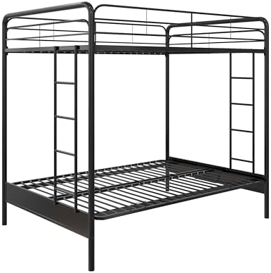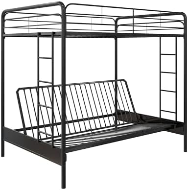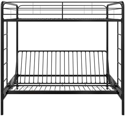 The contemporary DHP Sammie Full Over Futon Bunk Bed delivers the ultimate loft bed with futon experience for bedroom, dorm room, and guestroom ease. The multifunctional futon bunk bed is tailor-made for kids, teens, and young adults who want to hang out with family and friends without having to worry about small space limitations. Simply adjust the bunk bed with futon on the bottom into a full-size sleeper for convertible sofa to guest bed sleepover comfort and enjoy the full-size bed layout of the top bunk for space-saving satisfaction. The durable metal frame body includes two integrated ladders to let you easily reach the upper bunk, which is protected by 12-inch-high full-length safety guardrails and equipped with 2.5" spaced steel slats for sleep security and mattress support. The bunk bed couch accommodates 1 full-size mattress of a recommended 6" depth and 1 full-size futon mattress (both sold separately). No box spring is needed.