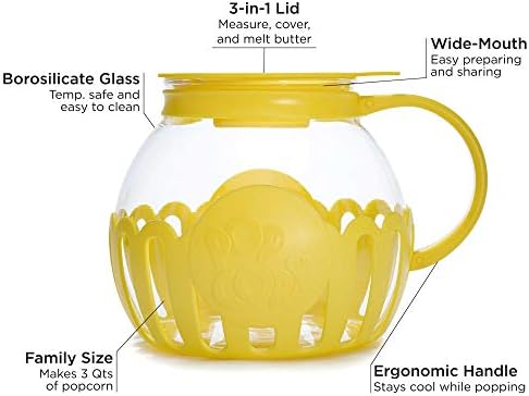 Brand Ecolution Color Yellow Capacity 3 Quarts Material Borosilicate Glass Product Dimensions 9.88"L x 7.69"W x 6.5"H Included Components Glass Popcorn Popper, 3-in-1 Lid Is Electric No Global Trade Identification Number 00741393476750 UPC 741393476750 Item Weight 1.83 pounds Manufacturer Epoca ASIN B08L8B67DQ Country of Origin China Item model number Ecolution Customer Reviews