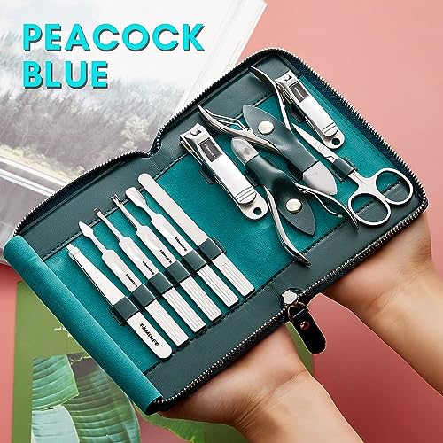 FAMILIFE Nail Kit, Professional Manicure Set Manicure Kit, 11 in 1 Stainless Steel Nail Clippers Set Pedicure Tools Kit, Men Grooming Kit with Portable Blue Leather Travel Case Luxury Gifts for Him