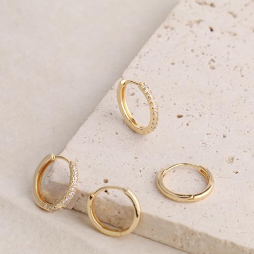 Gold Hoop Earrings Set 14k Real Gold Plated Huggie Hoop Earrings Hypoallergenic Tiny Lightweight Cartilage Cubic Zirconia Jewelry Everyday Earrings for Women Piercing