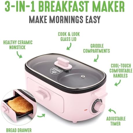 Want eggs, bacon, and toast? This sort of breakfast used to call for a few different pans (and a weekend-level amount of time). But now, this classic feast can be made during busy weekday mornings—with just one gadget. Meet: the 3-in-1 Breakfast Maker, which has two upper griddle compartments and a handy toast drawer. The quick-heating compartments feature our healthy ceramic nonstick coating (free of PFAS, PFOA, lead, and cadmium) for easy cleanup and incredible results. You can mix things up, too: Use it to make pancakes, veggies, sandwiches, and more.
