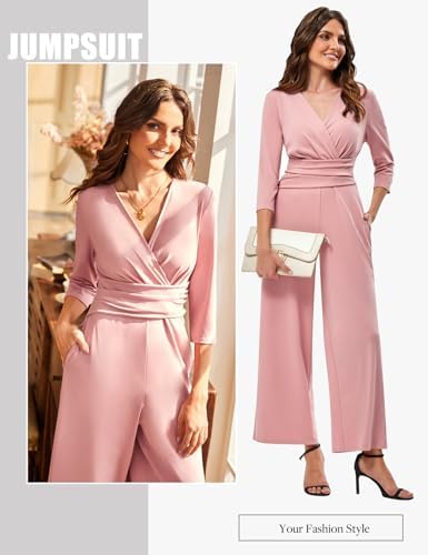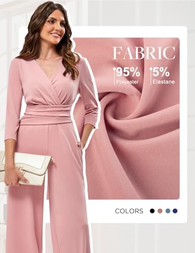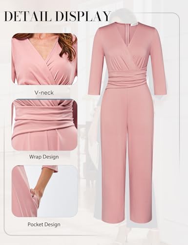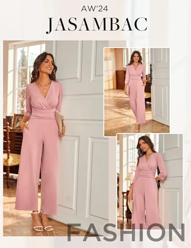 JASAMBAC 3/4 Length Sleeve Women's Jumpsuits Dressy Casual Wrap V Neck Empire Waist Romper Flowy Pants Outfits Overalls