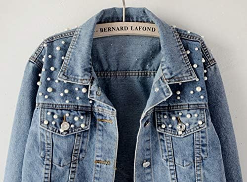 - Long sleeve, Turn down collar, pearl beading, button up denim jacket.