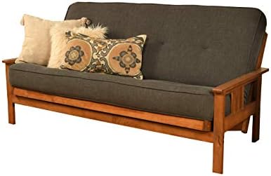 The Monterey futon is a classic hardwood frame with Mission style arms. This unique and versatile full-size futon sofa easily converts to a bed. This multifunctional piece of furniture can find a home in just about any type of room. The included mattress measures 75" L x 54" W x 8" H and has 276 coils for extra comfort. Maximum distributed weight: 500 pounds.