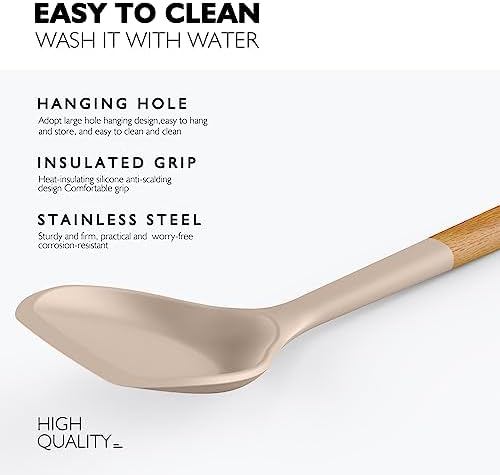 Large Silicone Cooking Utensils Set - Heat Resistant Silicone Kitchen Utensils for Cooking w Wooden Handles, Spatula Set, Kitchen Utensil Gadgets Sets for Non-Stick Cookware, BPA Free (Khaki)