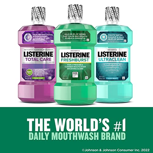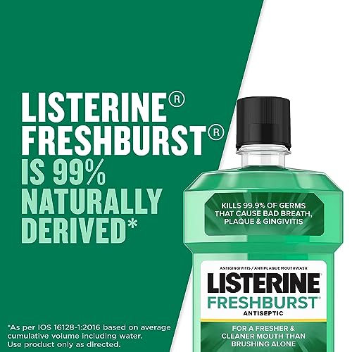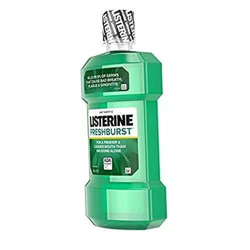 Protect your mouth from germs and get fresh breath with Listerine Freshburst Antiseptic Mouthwash. It kills 99.9% of germs that cause bad breath, plaque, and gingivitis for a fresher and cleaner mouth than brushing alone. Clinically shown to reduce 52 percent more plaque and 21 percent more gingivitis than brushing and flossing alone, this antiseptic mouthwash provides a deep clean that cares for your whole mouth. Listerine Freshburst Mouthwash is a recipient of the ADA Seal of Acceptance for fighting plaque and gingivitis. The great-tasting Freshburst spearmint flavor of this antiseptic mouthwash leaves your mouth feeling clean and fresh. With approximately 12 days in this 500-mL bottle, achieve maximum results by rinsing with this refreshing mouthwash for 30 seconds twice a day†, both morning and night, for 24-hour germ protection. *Based on laboratory testing. Data on file. Stock up with this 2-pack of 500 mL bottles of mouthwash.