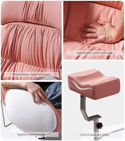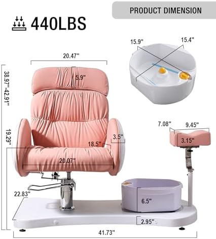 Brand OKAKOPA Color Pink-1 Product Dimensions 41.73"D x 22.83"W x 38.97"H Size Without stool Special Feature 360-degree swivel, reclining backrest, adjustable footrest, removable massage foot basin, ergonomic design Unit Count 1.0 Count Recommended Uses For Product Professional Nail Services Maximum Weight Recommendation 440 Pounds Pattern Solid Age Range (Description) Adult Included Components Foot Basin Shape irregular shape Arm Style Eggshell Surface Recommendation Hard Floor Furniture base movement Swivel Indoor/Outdoor Usage Indoor Furniture Finish Pink (painted) Cushion Style Boxed Edge Tilting No Is Electric No Chair Backrest Width 20.47 Inches Form Factor Recliner Manufacturer OKAKOPA Item Weight 100 pounds ASIN B0D876RD6M Customer Reviews 4.8 4.8 out of 5 stars 7 ratings 4.8 out of 5 stars Best Sellers Rank #288,931 in Beauty & Personal Care (See Top 100 in Beauty & Personal Care) #532 in Salon & Spa Chairs #54,475 in Beauty Tools & Accessories Date First Available June 27, 2024