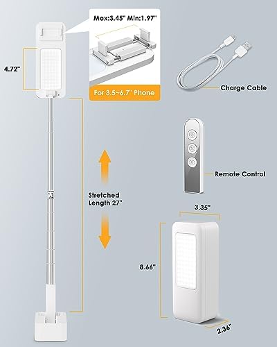Rechargeable for 9~35 hours lighting, portable, 10000 mAh power bank, extendable, multi angle, 3 color temperatures stepless dimming, magnet base, ambient light, Water Proof, SOS signal 2 replaceable holders, Clip-on, 360 degree swivel base, flexible long arm, foldable, steady, durable, space-saving Ring light tiltable, with wireless remote, tripod height angle adjustable, for phone/camera, 360° 1/4" ball head, DC power supply, ambient light 5.7" snack bowl attached, Extendable, floor stand, height angle adjustable, 360 rotate, foldable, overhead Clip on, space-saving, steady overhead recording for up to 13 inch tablet, height angle adjustable, flexible arm