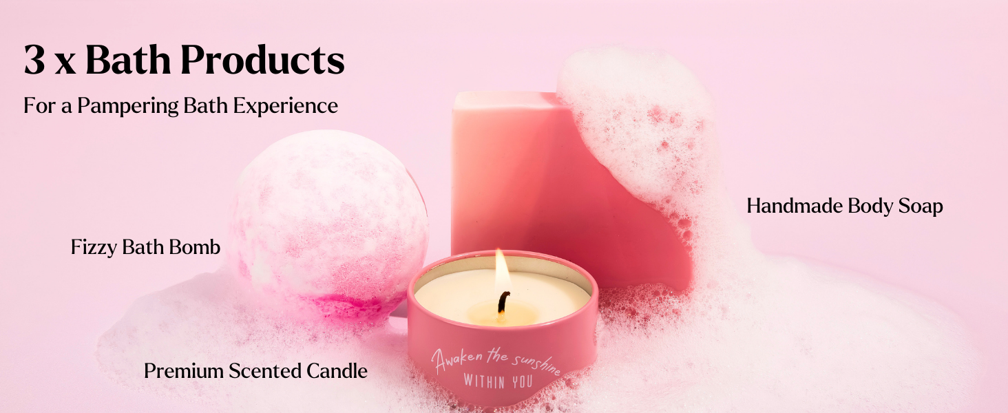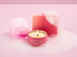 The pleasing aroma of a scented candle, luxurious lathers of Lavender-vanilla handmade soap, and a rich, fizzy bath bomb make your bath bubblicious!