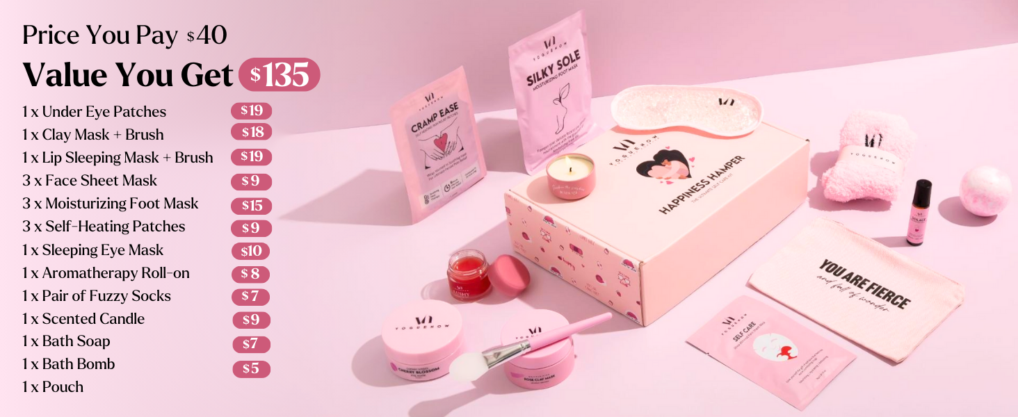 This makes one of the best spa gifts for women! Introducing Happiness Hamper Self Care Kit by VogueNow. This kit is curated with love and care for all the gorgeous women out there! It's time for you to take a little time and indulge yourself in self-love and care because you deserve it!