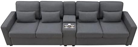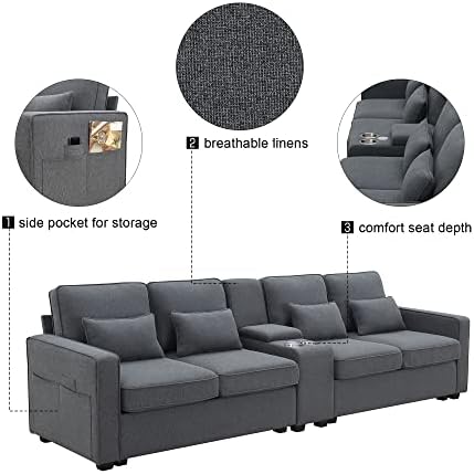 This couch is awesome! It’s comfy, in style and a great price! The couch arrived on time and in 3 boxes. Assembly took maybe an hour and instructions were simple to follow. The center console with cup holders and charging port are as pictured and is a great feature to have. Just buy it already!!