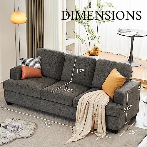 We needed a new couch but weren’t ready to invest in a longer term, more expensive one. After lots of searching, took the plunge and bought this one. It arrived quickly and in one very large box. Assembly was super easy - it took the two of us maybe 30 minutes, and I probably could have even done it myself. The cushions do take a little bit to expand to their full size, but once they do, the end result is a very comfy couch!The overall look is pretty nice - if inspected closely, you can tell it’s not a high end piece of furniture, but it still looks good. It seems pretty sturdy for its intended purpose, but if you have rowdy kids or like to jump on furniture yourself, I would look elsewhere, since the frame isn’t made from solid wood. The only issue we’ve had is with the chenille fabric not being a great choice with having a dog (his nails have snagged on it more than a few times), but that is more our fault than the couch. All in all, we are happy with the couch, especially for the price.