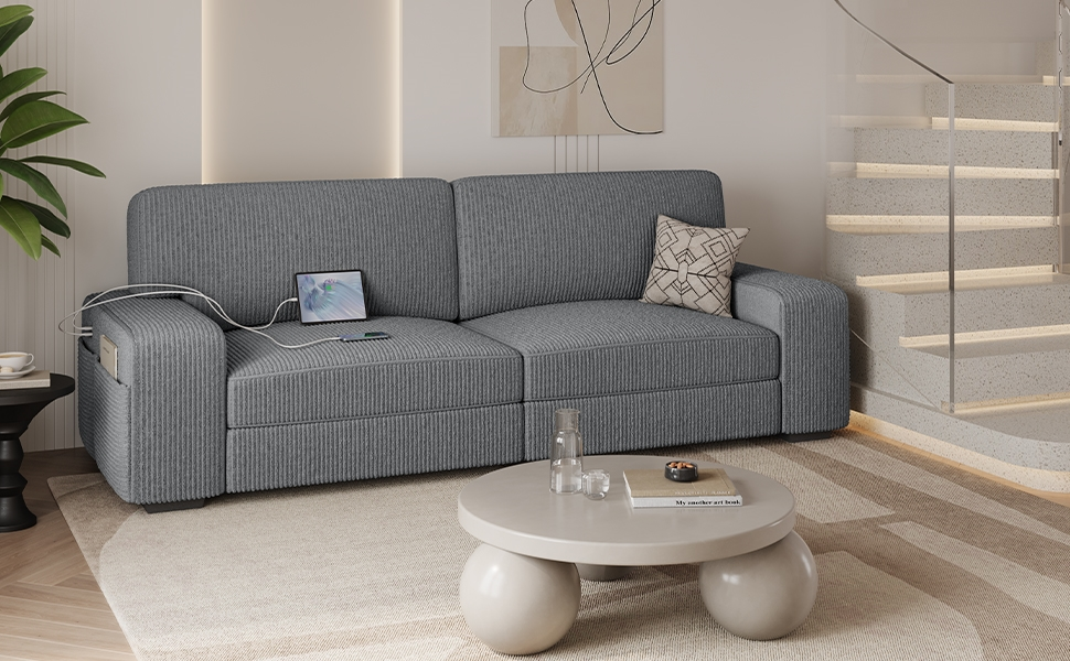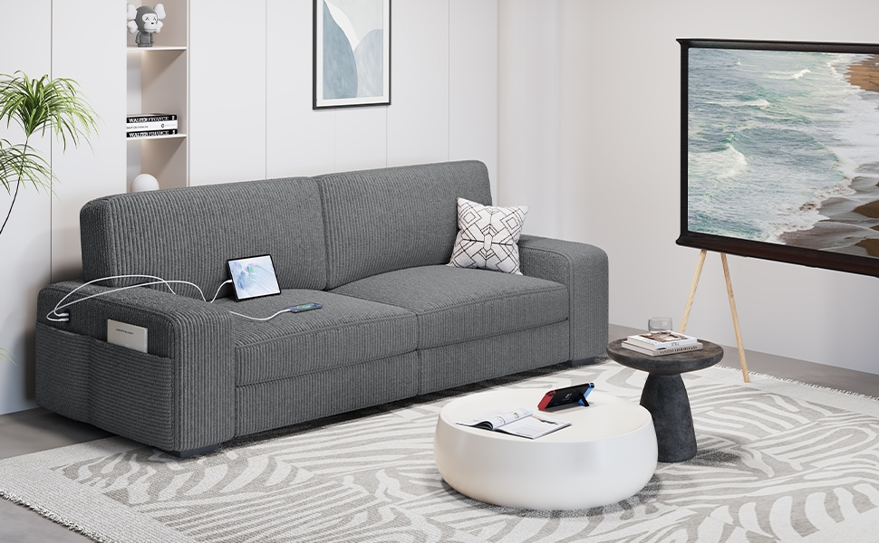 This large2-seater couch offers the perfect fusion of comfort, style, andfunctionality, bringing a cozy, contemporary vibe to any space. Thebroad track arms, plush cushions, and low-slung silhouette make it acenterpiece, while the luxurious, corduroy-like upholstery adds apersonal touch. The wide square arms, foam-filled back pillows, andthickly padded seat cushions ensure a better sitting experience forvarious activities such as watching TV, reading, napping, or gaming. Itsside storage pockets and two integrated USB charging outlets furtherimprove its utility. Some assembly is required.